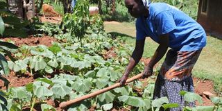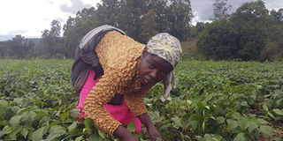 Josephine Nyanweso of Ebukhaya village in Vihiga county on her farm weeding her indigenous vegetables that she planted using organic fertilizer . PHOTO | ISAAC WALE |