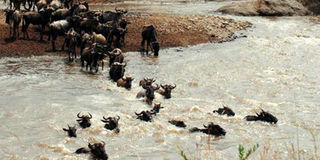 Thousands of Wildebeest cross River Mara on June 9, 2016 to usher in the tourists' peak season in the world famous Maasai Mara Game Reserve.