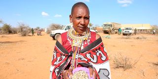 Nelly Keshine, a pastoralist from Ilmotiok, holds a mix of drought-resistant grass and African foxtail