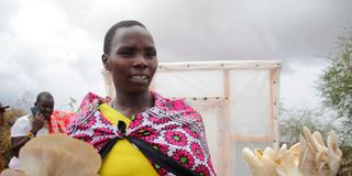 Pauline Nakwet, a member of Green Earth Warriors, displays freshly harvested mushrooms in Ilmotiok.