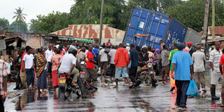 Residents of Magongo in Mombasa block the road following flooding in their houses, May 31, 2015. They were demanding an immediate solution to the problem.