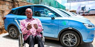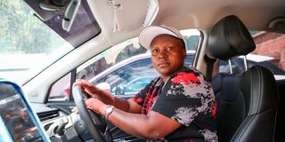 Rebecca Kimuma in her Neta V electric vehicle on October 9 at Moja EV Kenya Limited offices in Nairobi.