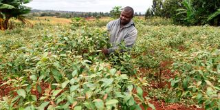 A farmer working on his Muguka farm in Gatitika Vilage, Kirinyaga County on July 5, 2023.
