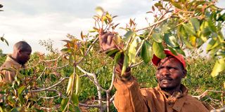 Naftaly Kirimi (in red cap) a miraa (Khat) farmer inspects the plant in his one-acre farm along Nyahururu- Nyeri highway at Ngobit ward, Makutano area in Laikipia county.