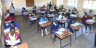 Standard Eight pupils from Sinoni Primary School in Mochongoi, Baringo County, write their Kenya Certificate of Primary Education examination English Paper at Mochongoi High School after they were relocated for safety following attacks by bandits from the neighbouring community on March 07, 2022.
