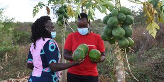Fruits of activism against gender-based violence: ActionAid Kenya Interim Executive Director, Susan Otieno (right) with Anastacia Plilan, harvest pawpaw fruits at Anastacia’s farm in Tangulbei, Baringo County.