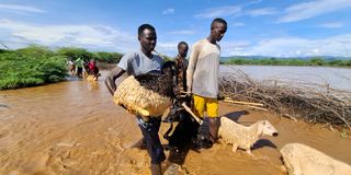 Residents of the flooded Ilbolei village in Baringo South try to evacuate goats and sheep that were stranded after the Perkerra and Milo rivers burst their banks.
