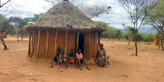 Chepkikigho Tongelech, 76, outside their dilapidated hut with four of her grand children in Loyamoi, Tiaty West. The elderly woman has been left behind with the minors after other members moved to the neighbouring West Pokot County in search of water and pasture for their livestock owing to the long dry spell.