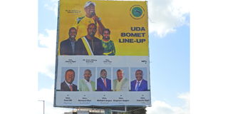United Democratic Alliance (UDA) campaign posters erected in Bomet town bearing photos of Deputy President William Ruto, Bomet Governor Hillary Barchok, seven parliamentary candidates in this photo taken on June, 3, 2022, before it was pulled down a week ago. It has since been replaced with one bearing Dr Ruto and Professor Barchok's photos in changing campaign strategy