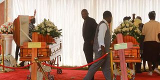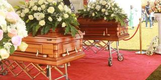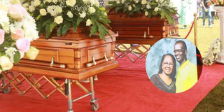 Burial photos including caskets and profile photos of Joseph Lugadiru Omido and his wife Margaret Kavuu Mutua Omido(inset) during their send off at their home in Ndalu, Bungoma on September 9, 2025.