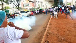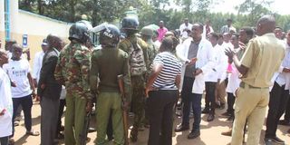 Police officers engage with striking doctors at the Kakamega County General Hospital.