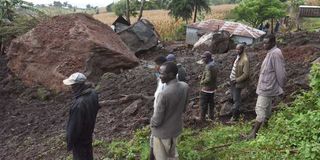 Massive rocks at a homestead in Kipkenda village, Keiyo North of Elgeyo Marakwet County on November 3, 2025. A woman and her grandson died in the November 2 mudslide.