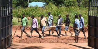 Locals at Chesongoch in Kerio Valley, Elgeyo Marakwet County, carry the body of one of the victims killed in the Friday night mudslide tragedy.
