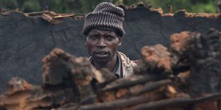 Benjamin Ruto, who lives at Kipsitona village within Kapkok Glade in Embobut Forest, Elgeyo Marakwet County, inside his burnt house on May 02, 2024.