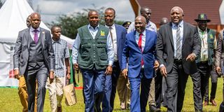 Deputy President Kithure Kindiki (Second, left) arrives at the University of Embu for the national macadamia conference on June 4, 2025.