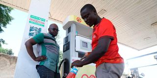 An attendant at Eon Petrol station in Homa Bay Town puts fuel in a plastic water bottle on April 8,2026. Fuel shortage has hit the town.