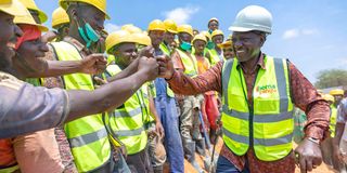 President William Ruto interacts with construction workers during the inspection of the construction progress of the 408-unit Garissa Affordable Housing Project on February 6, 2025.