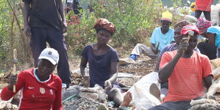 Residents of Rang’wa East in Suba central in Homa Bay County crush rocks before they are taken for processing for gold on July 13, 2025.
