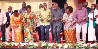 President William Ruto is joined by Homa Bay Governor Gladys Wanga, Treasury Cabinet Secretary John Mbadi, his Energy counterpart Opiyo Wandayi and other leaders at Agoro Sare High School in Kasipul for an interdenominational prayer service on March 22,2026.