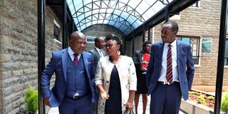Controller of Budget Margaret Nyakang’o (centre) with Council of Governors Finance chair and Kakamega Governor Fernandes Barasa (left) and his Kisii counterpart Simba Arati.