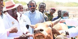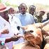 President William Ruto vaccinates a cow during the flagging off of animal vaccination and the National Livestock Restocking Programme at Soko Ng'ombe in Garissa County On February 6, 2025. Looking on is Daadab MP Farah Maalim.