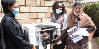 Ms Jaldesa (right) donates an oven to members of Kulamawe youth group.