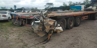 A part of the ill-fated vehicle still attached on the edge of a trailer at Isinya police station. Kajiado Central.