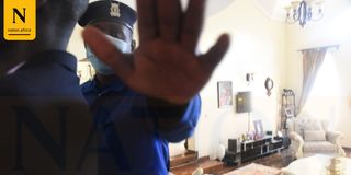 A police officer blocks journalists from taking pictures at the home of former Kakamega governor Wycliffe Oparanya on August 23, 2023.