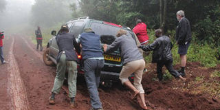 A group of people push a vehicle from mud after it got stuck due to heavy rains in a past photo. Kakamega and its environs witnessed a heavy downpour last evening.