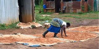A gold mines dealer dry soils to extract gold at Rostermines in Kakamega.