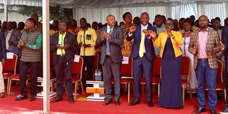 Left to right: Kenya Kwanza Presidential Running-mate Rigathi Gachagua, Kericho Governor Paul Chepkwony, Senator Moses Watengula and Governor Hillary Barchok during a UDA prayer rally in Kericho town
