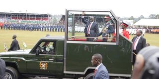 President William Ruto arrives at the Kericho Green Stadium for Mashujaa Day fete on October 20, 2023.