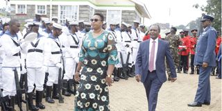 First Lady Rachel Ruto arrives at the Kericho Green Stadium for Mashujaa Day fete on October 20, 2023.