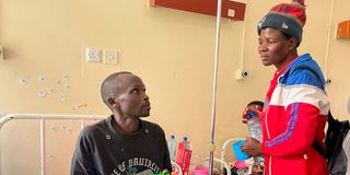 Jacinta Nekesa with her husband Geoffrey Mugendi at Kiambu Level 5 Hospital on July 10, 2025. Geoffrey Mugendi was injured by a bullet during the Saba Saba protest, which resulted in the amputation of his leg.