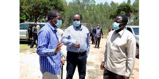From left: MPs Opiyo Wandayi (Ugunja), Paul Koinange (Kiambaa) and Opondo Kaluma (Homa Bay Town) during the official opening of Sidindi Police Station in Ugunja, Siaya on February 5, 2021.