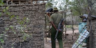 A police officer manning a home in Binzaro, Chakama Ranch, where a body of a middle-aged man was found. Authorities say at least eight people are being investigated in what appears like the Shakahola cult.