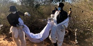 Morticians carry the remains of a person exhumed at Kwa Bi Nzaro village within the vast Chakama Ranch in Kilifi County on August 28, 2025.