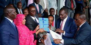 Kisii Governor Simba Arati (second right) ,his deputy Robert Monda (ight) and other county senior staff receive a report from Institute of Human Resource Management (IHRM) Executive Director Quresha Abdullahi (second left) and IHRM National Chairman Odero Phillip (left) at Gusii Stadium on February 15, 2023.