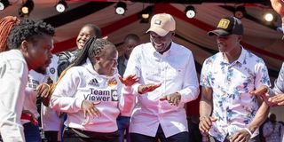 President William Ruto joins in a youth dance while presiding over the disbursement of the Nyota Business Start-Up Capital for young entrepreneurs from Kisii, Nyamira and Migori counties at Gusii Stadium.