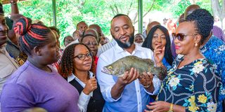 Ali Hassan Joho (second right), Cabinet Secretary for Mining, Blue Economy and Maritime Affairs and Betty Njagi (second left), Permanent Secretary for Blue Economy visit a fish banda at Ogal Beach in Kisumu County on August 20, 2024.