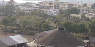 Jomo Kenyatta Sports ground in Kisumu with Lake Victoria and the city's CBD in the background.
