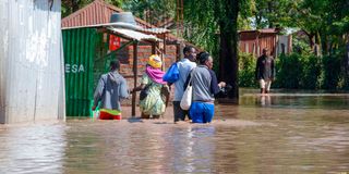 Residents of Ahero town, Nyando Sub-County, wade through floodwaters on November 29, 2024.