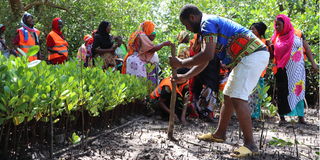 Member of Siwema Jikaze Women Group plant mangroves in Shirazi area in Ramisi, Kwale County on May 26,2022.