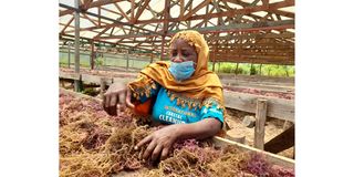 Fatuma Mohammed, seaweed farmer and the Chairperson of Kibuyuni Seaweed Farmer's Cooperative out harvested seas weeds that are set for drying in Kwale County. Kenya Marine and Fisheries Research Institute (KMFRI) plans to extend the cultivation to Tharaka Nithi County and boost the blue economy.