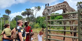 Tourists feed a giraffe named Kwale at the Bora Bora Wildlife Park in Diani, Kwale County. Tourism in the coast region has improved after the peaceful electioneering period.