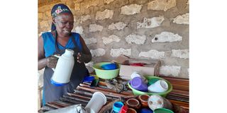 Rose Khayanje, a resident of Umoja Estate in Mvindeni working at her café business near the Mvindeni Junction. She set up the business after the road was tarmacked and hopes to have more customers.