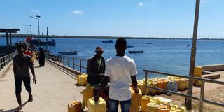 At the Shimoni jetty, tens of full jerrycans are lined up waiting for their owners to get boats and transport them back to the island.