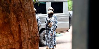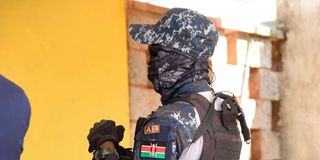 Anti-Terrorism Police Unit (ATPU) tactical team member guards the entrance of a Kiambu Law Court on February 2, 2021.