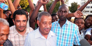 Lamu County Governor Mr Issa Timammy (centre) leaves Malindi High Court accompanied by his supporters after the high court nullified his election on September 26, 2013. PHOTO/LABAN WALLONGA.