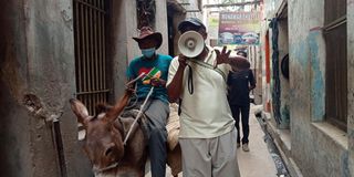 Mr Shee passing out announcements along the narrow streets of Lamu Old Town